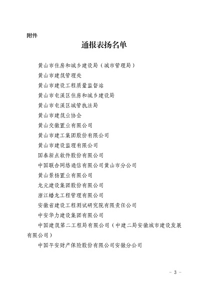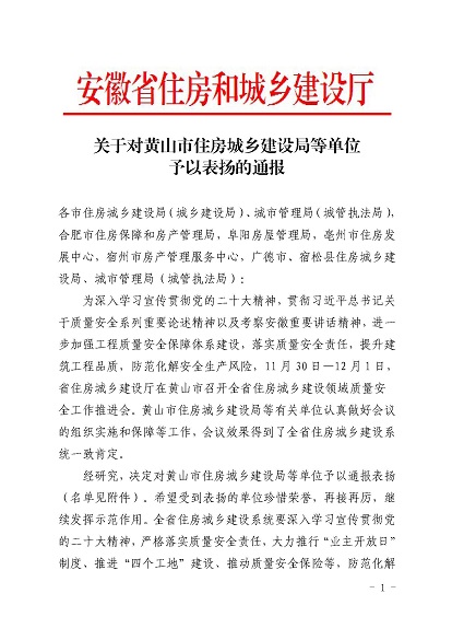近日,安徽省住房和城鄉建設廳印發(fā)《關(guān)于對黃山市住房和城鄉建設局等單位予以表?yè)P的通報》,《通報》指出,11月30日-12月1日,省住房和城鄉建設廳在黃山市召開(kāi)全省住房建設領(lǐng)域質(zhì)量安全工作推進(jìn)會(huì ),會(huì )議效果得到全省住房城鄉建設系統一致肯定,并對在此次會(huì )議認真做好組織實(shí)施和保障的單位予以通報表?yè)P,黃山市建工集團股份有限公司作為唯一一家本土建筑施工企業(yè)榮獲表?yè)P。