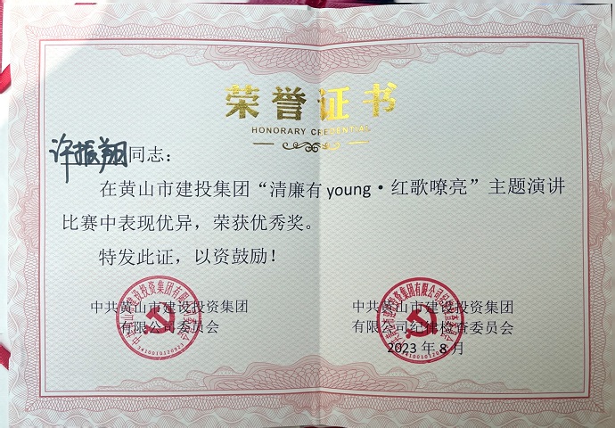 為慶祝中國共產(chǎn)黨成立102周年,深入推動(dòng)學(xué)習貫徹習近平新時(shí)代中國特色社會(huì )主義思想主題教育,全面貫徹落實(shí)黨的二十大精神,8月18日,由黃山建投集團舉辦的“清廉有young·紅歌嘹亮”主題思政課隆重舉行,參賽選手以生動(dòng)的語(yǔ)言、動(dòng)聽(tīng)的歌聲、真摯的感情為大家帶來(lái)一場(chǎng)別開(kāi)生面的視聽(tīng)盛宴,黃山建工集團青年員工許振翔在思政課演講比賽中取得優(yōu)勝獎。