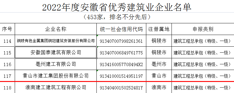 近日,安徽省住房和城鄉建設廳發(fā)布了“2022年度安徽省優(yōu)秀建筑業(yè)企業(yè)”名單,黃山建工集團憑借企業(yè)經(jīng)營(yíng)發(fā)展、管理創(chuàng )新能力、企業(yè)建造能力、企業(yè)文化建設、社會(huì )責任履行等方面的卓越表現再次名列榜單――建筑工程總承包類(lèi)(特級、一級類(lèi)別)省優(yōu)秀建筑業(yè)企業(yè),連續多年斬獲該項殊榮。