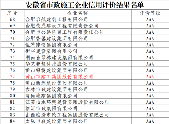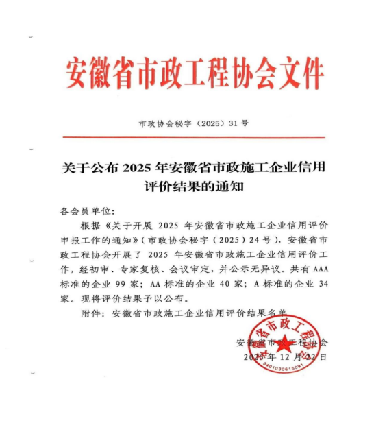 近日,安徽省市政工程協(xié)會(huì )正式發(fā)布《關(guān)于公布2025年安徽省市政施工企業(yè)信用評價(jià)結果的通知》。黃山市建工集團憑借卓越的綜合實(shí)力、規范的市場(chǎng)行為、優(yōu)良的工程品質(zhì)及堅實(shí)的信用體系建設,成功獲評最高信用等級——AAA級。標志著(zhù)集團在誠信經(jīng)營(yíng)、履約能力與社會(huì )責任履行方面獲得了行業(yè)主管部門(mén)與協(xié)會(huì )的高度認可,是企業(yè)信用建設領(lǐng)域的又一重要里程碑。
