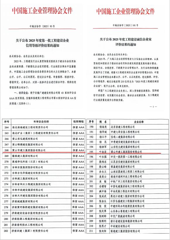 近日,國(guó)家及省級(jí)行業(yè)協(xié)會(huì)相繼公布關(guān)于2025年度工程建設(shè)領(lǐng)域系列信用評(píng)價(jià)與先進(jìn)評(píng)選的結(jié)果,黃山市建工集團(tuán)股份有限公司憑借卓越的綜合實(shí)力、良好的市場(chǎng)信譽(yù)和穩(wěn)健的經(jīng)營(yíng)表現(xiàn),在多個(gè)權(quán)威評(píng)選中脫穎而出,收獲累累碩果,再次彰顯了公司在行業(yè)內(nèi)的領(lǐng)先地位與誠(chéng)信標(biāo)桿形象。
